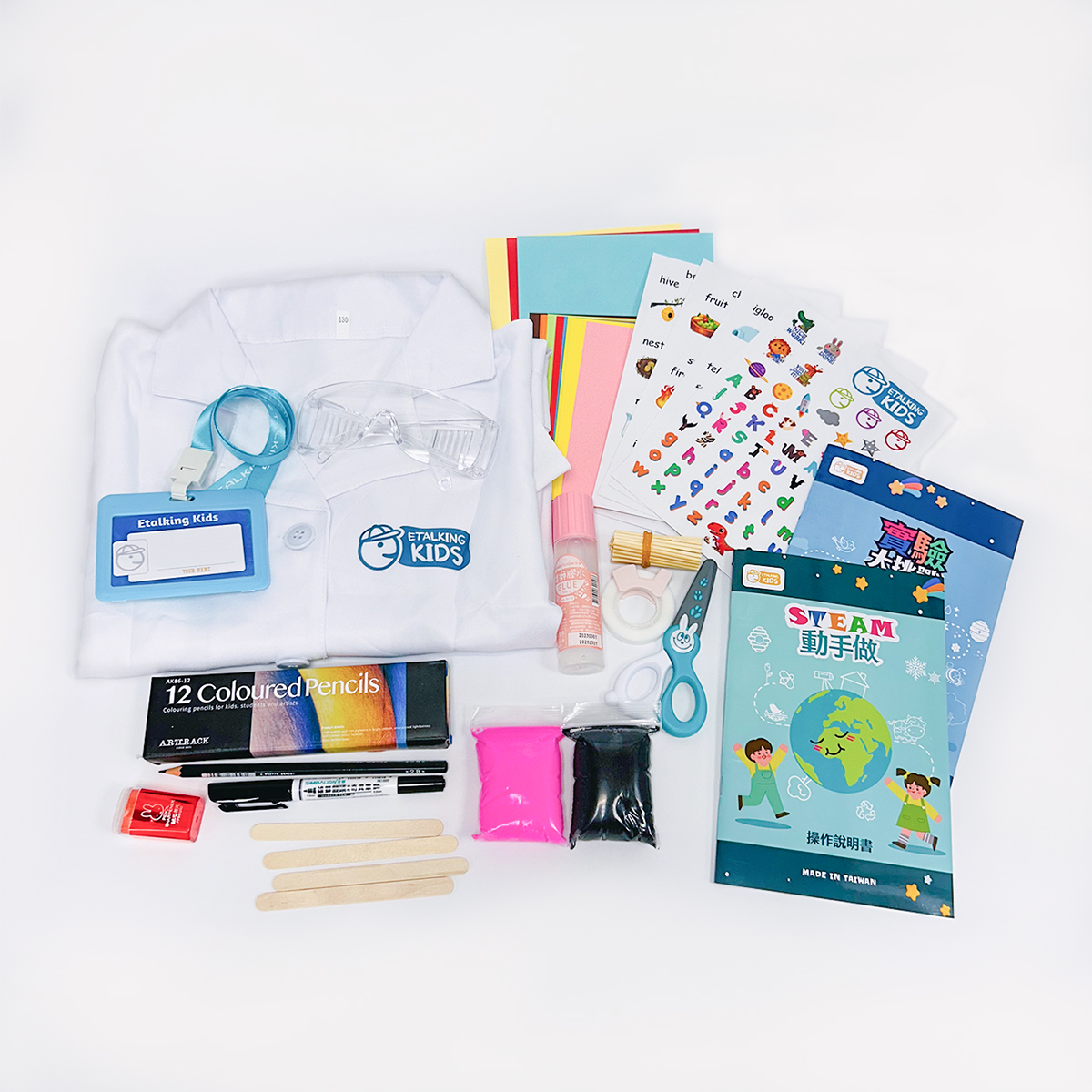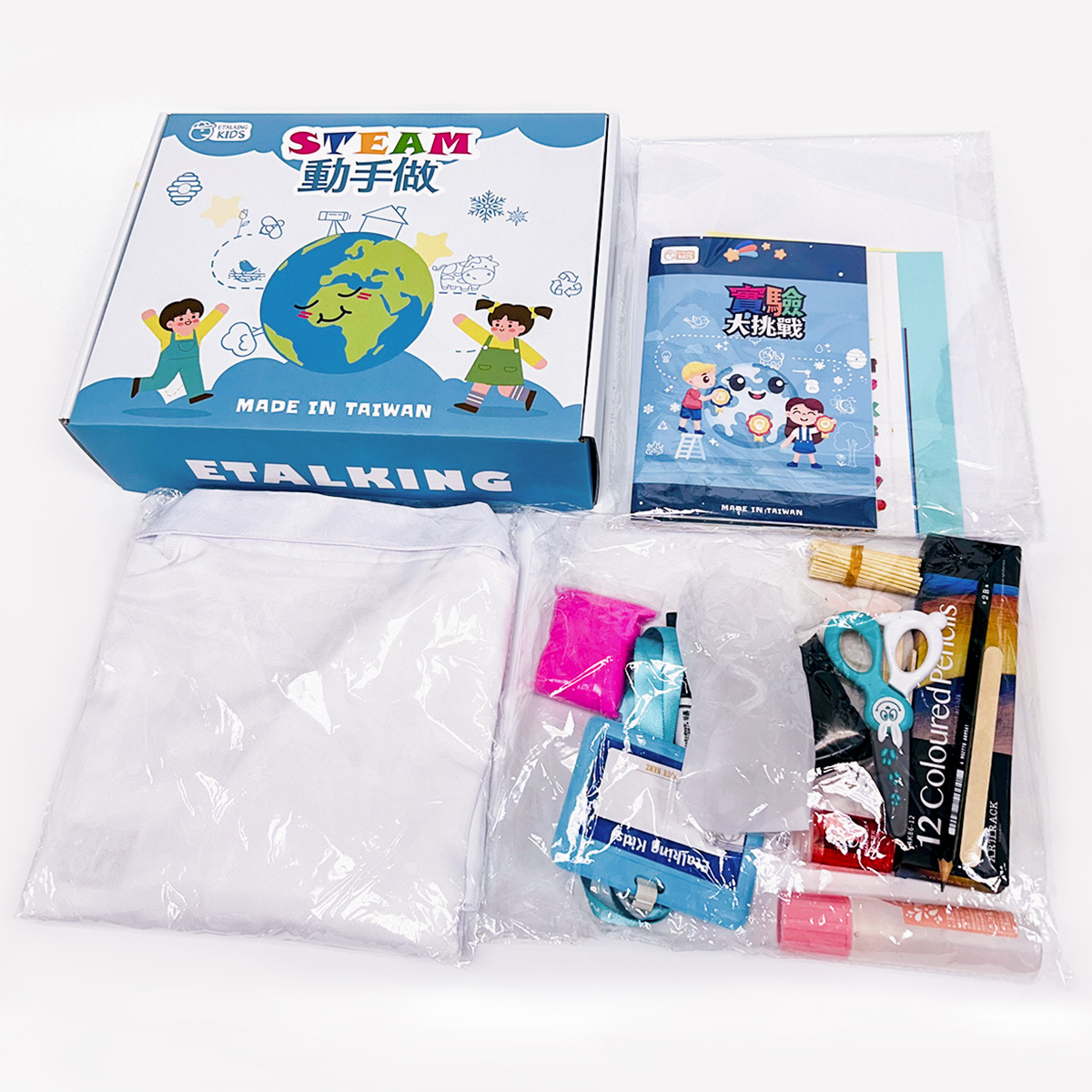 當你打開「STEAM動手做」教材包,內容物一目瞭然,分為三部分。第一部分是嶄新潔白的科學實驗服,許多小孩打開後都驚聲尖叫,迫不及待地穿上它。之後再戴上「護目鏡」和「識別證」,不禁都覺得自己變身為「小小科學家」。